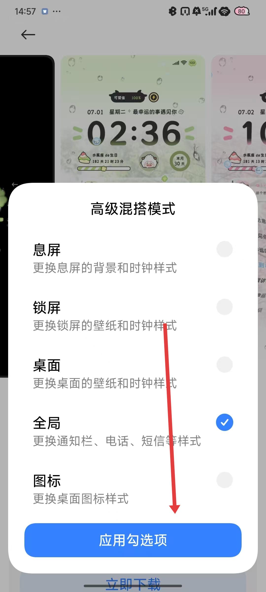 3、下載完成后,若出現(xiàn)高級(jí)混搭模式彈窗,可按需勾選息屏、鎖屏等選項(xiàng),最后點(diǎn)擊應(yīng)用勾選項(xiàng)即可完成主題設(shè)置。