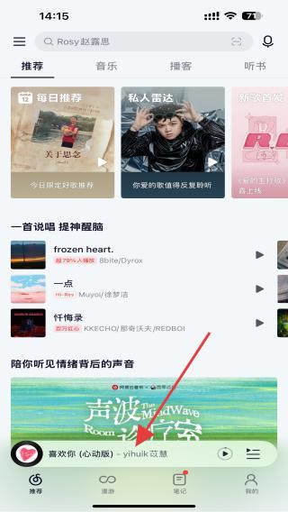 1、啟動APP進入到首頁內(nèi),點擊正在播放的音樂。