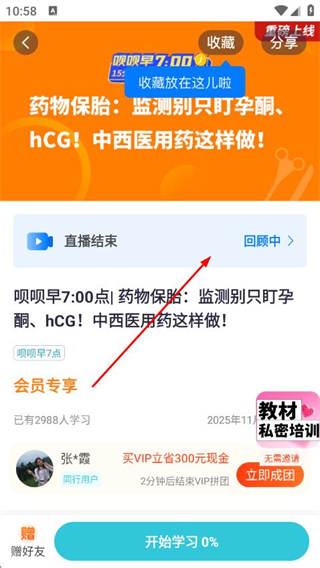 3、點擊該課程進入詳情頁,找到回顧中并點擊。