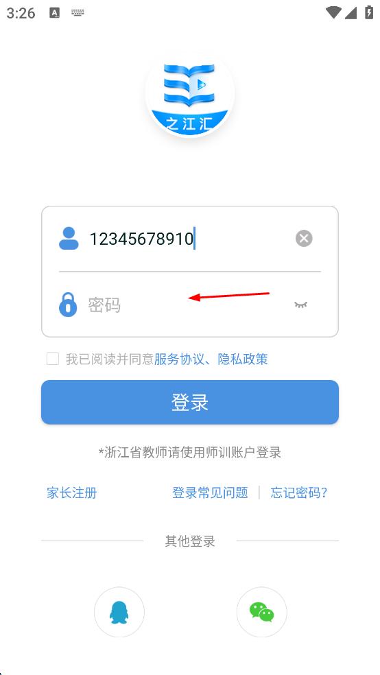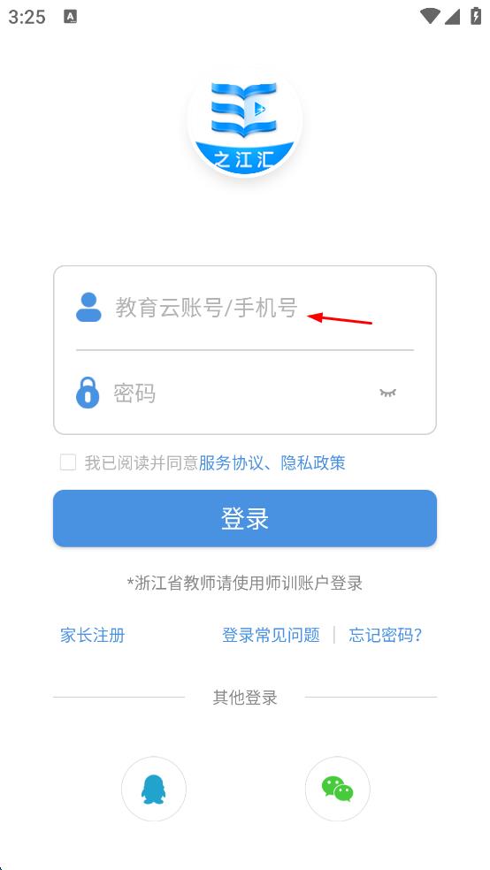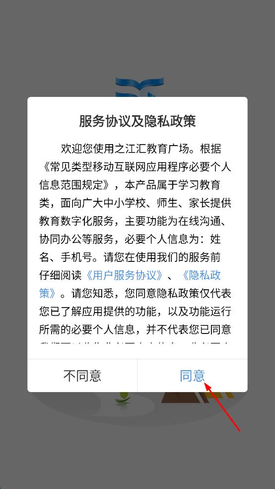 1、打開之江匯教育廣場APP,出現(xiàn)服務(wù)協(xié)議及隱私政策界面,仔細(xì)閱讀后點(diǎn)擊“同意”,進(jìn)入登錄頁面。