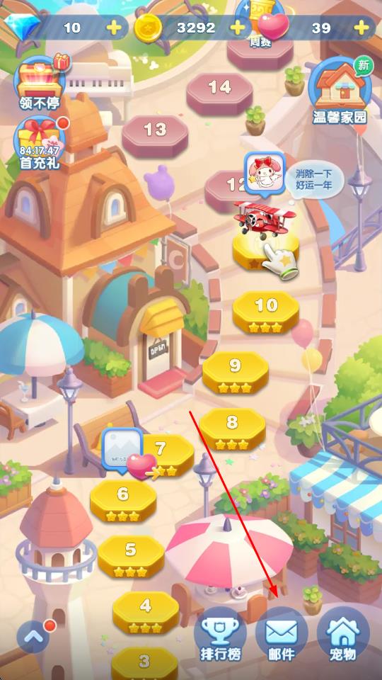 1、打開天天愛消除游戲,進(jìn)入游戲主界面,點擊下方的郵件圖標(biāo)。