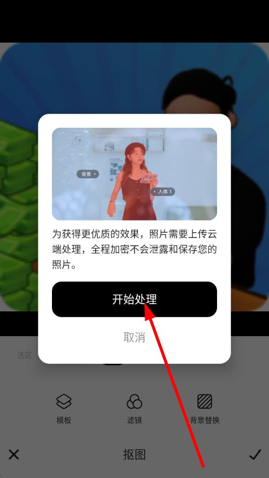 3、彈出提示框后,點擊開始處理,美圖秀秀將自動上傳云端、加密處理,完成摳圖,助力創(chuàng)意修圖設計。
