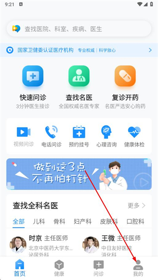 1、打開名醫(yī)在線app,點(diǎn)擊底部導(dǎo)航欄中的我的選項(xiàng)。