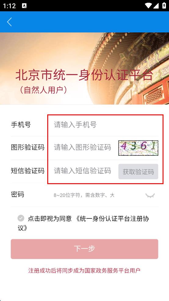3、在注冊界面,依次輸入手機號、圖形驗證碼,點擊“獲取驗證碼”,輸入收到的短信驗證碼,設置符合要求的密碼。