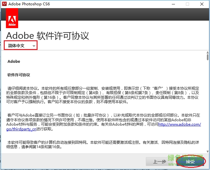 4.然后就到了Adobe軟件協(xié)議的地方(如下圖),點(diǎn)擊“接受”即可。注意左上角顯示的是簡(jiǎn)體中文哦,如果不是,就選擇安裝的語(yǔ)言。