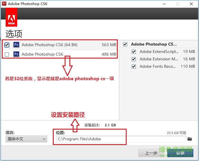 6.接下來(lái)讓我們選擇安裝位數(shù),軟件會(huì)根據(jù)你電腦自動(dòng)生成32和64位。由于小編的電腦是64位的,所以顯示的是adobe photoshop cs(64 bit)和adobe photoshop cs,可以兩個(gè)都安裝,也可只安裝那個(gè)64 bit的。位置那個(gè)地方就是設(shè)置安裝路徑了。