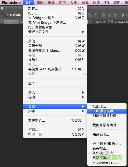 1、打開Photoshop CS6桌面快捷方式,打開軟件后點(diǎn)擊頂部菜單欄的“文件”,在彈出的選項(xiàng)中點(diǎn)擊“自動(dòng)”在二級(jí)菜單欄中點(diǎn)擊“PDF演示文稿”。
