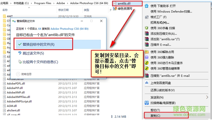 10.小編的是64位系統(tǒng),所以要打開64那個(gè)文件夾,復(fù)制里面的“amtlib.dll”到安裝目錄,會(huì)提示覆蓋,點(diǎn)擊“替換目標(biāo)中的文件”即可