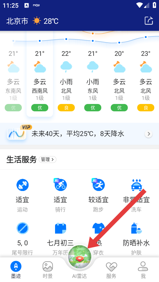 1、打開墨跡天氣APP的主界面,需要點(diǎn)擊底部中間的AI雷達(dá)按鈕,進(jìn)入天氣雷達(dá)圖的頁面。