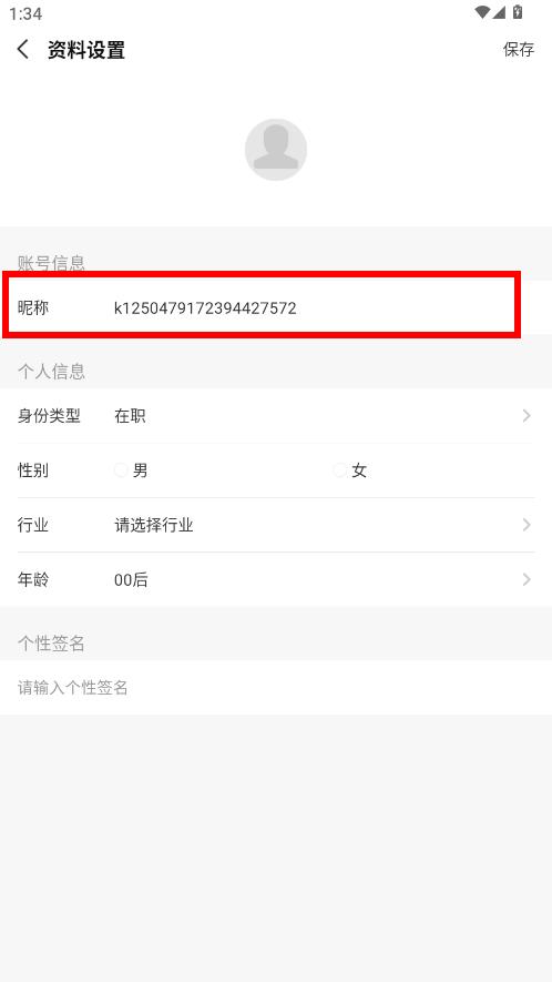 4、在資料設(shè)置界面,找到昵稱選項(xiàng),點(diǎn)擊昵稱對(duì)應(yīng)的輸入框,修改昵稱后點(diǎn)擊保存即可。