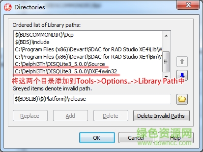 2、接下來將Source目錄和DX4目錄添加到DelphiXE4的Tools->Options…->Library path中,基于DISqlite3的程序在編譯的時(shí)候需要,如下圖所示: