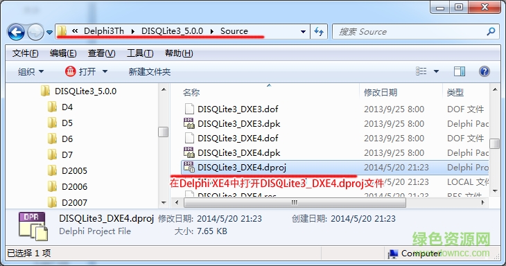 3、在Delphi XE4 的IDE中打開DISQLite3安裝目錄中的Source目錄中的DISQLite3_DXE4.dproj文件,如下圖所示:
