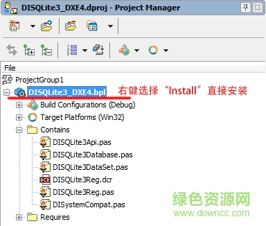 4、打開.dproj文件后在project Manager中點(diǎn)擊DISQLite3_DXE4.bpl上點(diǎn)擊右鍵Install,至此已經(jīng)安裝完畢該組件了。