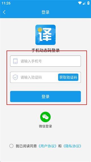 4、在手機(jī)動(dòng)態(tài)碼登錄界面輸入手機(jī)號(hào)和驗(yàn)證碼,點(diǎn)擊登錄按鈕完成登錄。