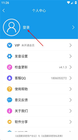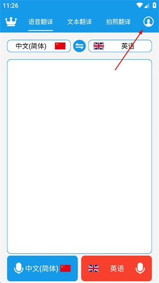 1、在翻譯APP主界面點(diǎn)擊右上角人形圖標(biāo),進(jìn)入個(gè)人中心界面。