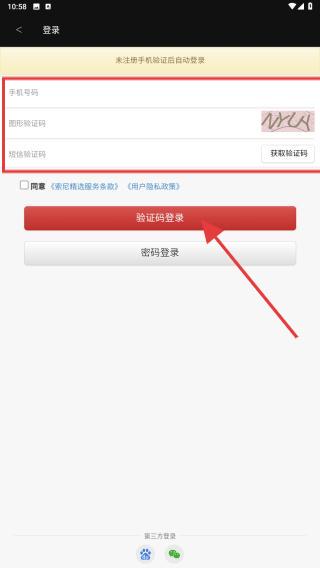 4、在登錄頁面,根據(jù)上方文字提示:若未注冊,注冊后會自動登錄,并在輸入框輸入注冊的手機號、圖形、短信驗證碼,再點擊按鈕。