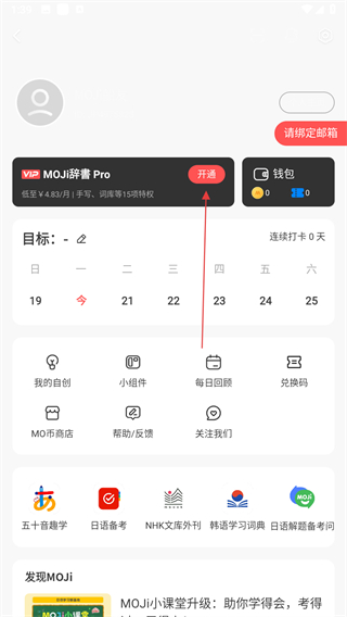 2、在個人中心頁面中,找到VIP MOJi辭書Pro區(qū)域,點(diǎn)擊開通按鈕。
