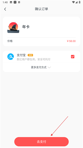 4、在確認(rèn)訂單頁面,選擇支付方式,然后點(diǎn)擊去支付,完成支付即可。