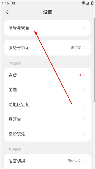 3、進(jìn)入設(shè)置頁面后,點(diǎn)擊上方賬號與安全選項。