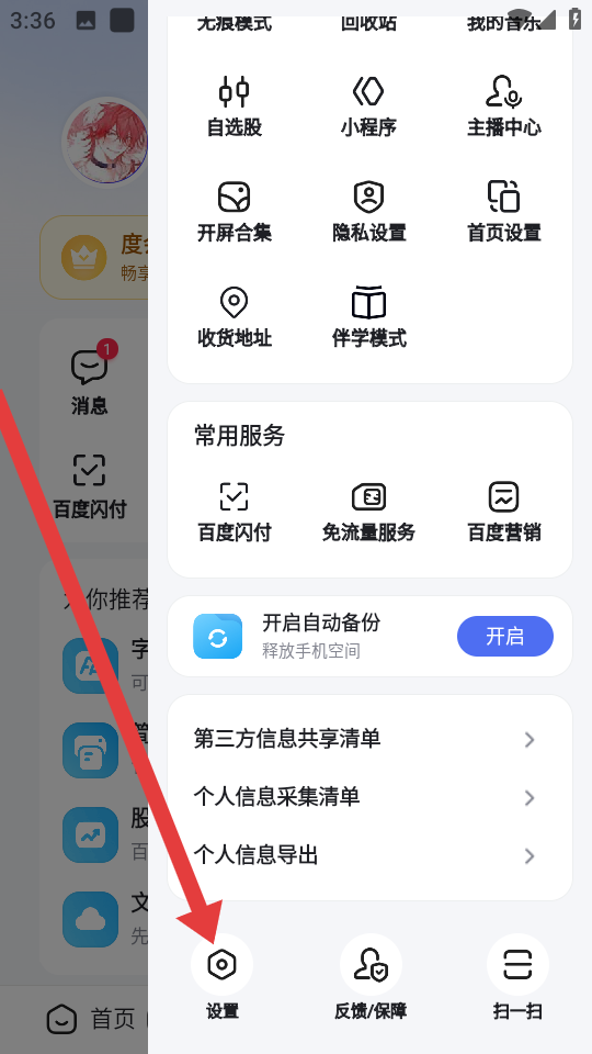1、打開百度APP,在側(cè)邊的功能欄中找到并點擊設(shè)置的選項,進(jìn)入設(shè)置的界面。