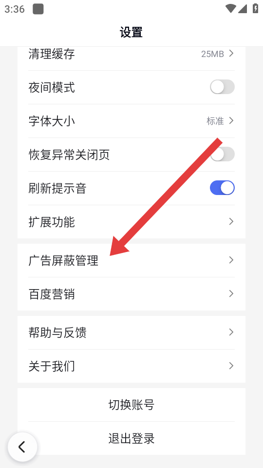 2、在設(shè)置的界面中,找到廣告屏蔽管理選項并點擊,進(jìn)入廣告屏蔽管理的頁面。