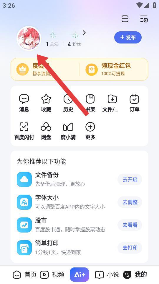1、打開百度APP,進(jìn)入我的頁面,需要點擊左上角個人的頭像,進(jìn)入個人的主頁。