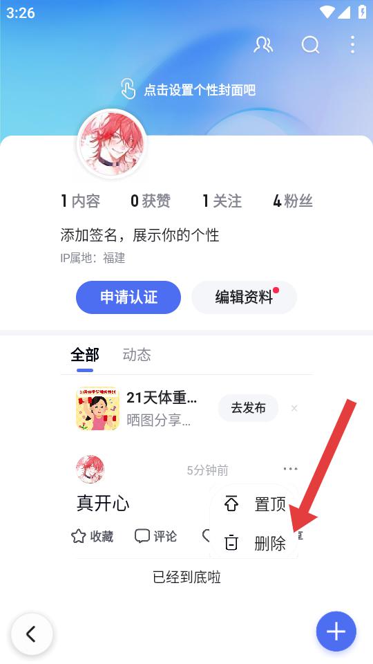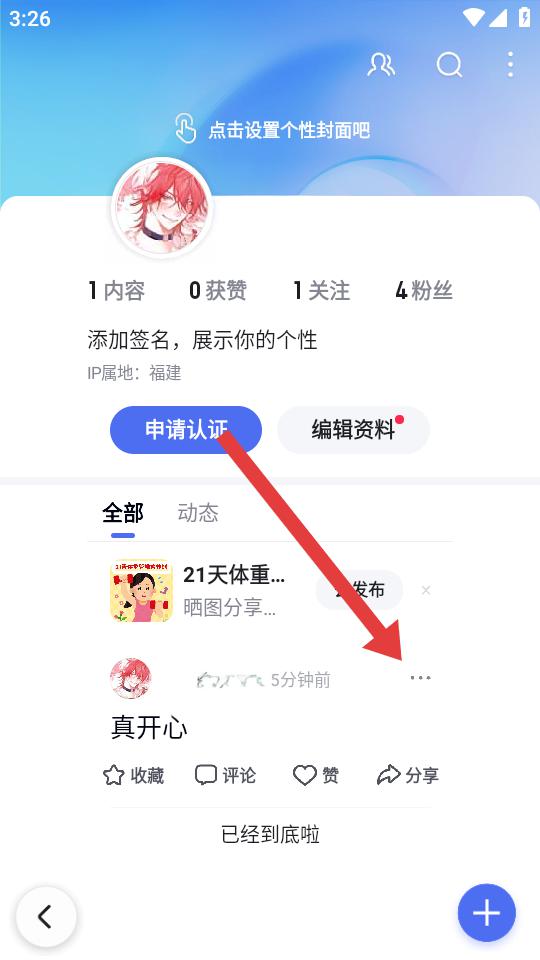 2、在個人的主頁中,找到需要刪除的作品如動態(tài)真開心,點擊作品右側(cè)的…按鈕,調(diào)出操作的菜單。
