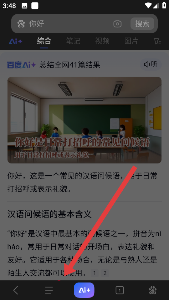 1、打開(kāi)百度APP的軟件,在搜索的頁(yè)面點(diǎn)擊底部三個(gè)橫桿的圖標(biāo),調(diào)出系統(tǒng)的功能選項(xiàng)欄。