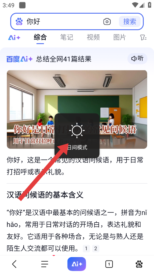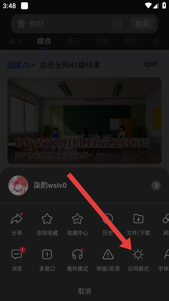 3、點(diǎn)擊日間模式的按鈕后,就可以關(guān)閉夜間的模式,切換為日間模式時(shí)會(huì)彈出顯示在界面。