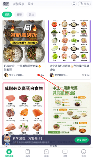 1、進(jìn)入瘦吧APP瘦圈板塊,瀏覽減脂蓋澆飯、高蛋白食物等帖子,查看作者分享的減脂經(jīng)驗(yàn)與食譜,通過(guò)點(diǎn)贊互動(dòng),獲取適合自身的減脂靈感與方法。