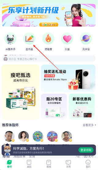 2、切換至瘦吧板塊,點(diǎn)擊查熱量等功能入口,借助AI營(yíng)養(yǎng)師分析飲食,參與抽獎(jiǎng)送禮等活動(dòng),挑選瘦吧甄選商品,還能根據(jù)推薦體脂師,定制專(zhuān)屬減脂規(guī)劃。