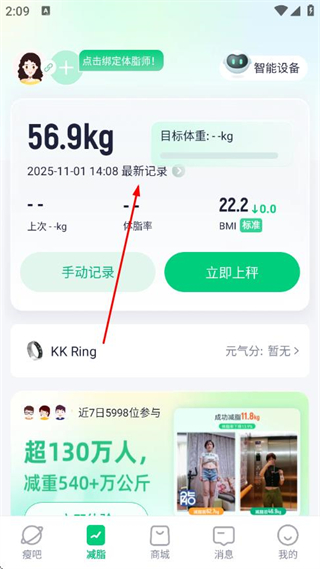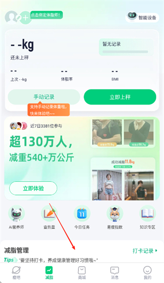 3、打開(kāi)減脂板塊,選擇立即上秤記錄體重體脂,或手動(dòng)錄入數(shù)據(jù),查看超130萬(wàn)人減重成果,利用AI營(yíng)養(yǎng)師、查熱量等工具,輔助日常減脂管理。