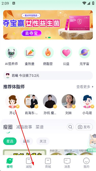 1、打開(kāi)瘦吧APP,點(diǎn)擊底部導(dǎo)航欄減脂。