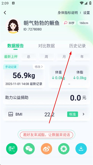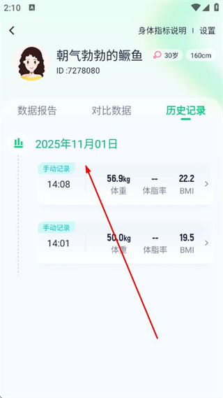 4、在歷史記錄頁(yè)面即可查看體重記錄信息。