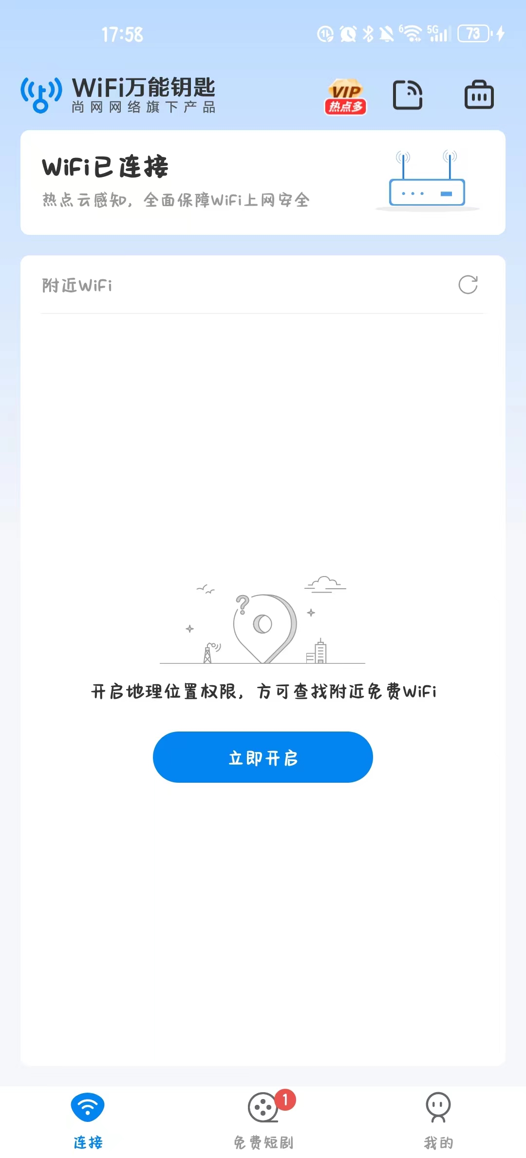wifi萬能鑰匙是基于分享經(jīng)濟模式而推出的免費上網(wǎng)服務(wù)。通過云計算技術(shù),將熱點主人分享的閑置wifi資源進行利用,幫助更多的人上網(wǎng)。用戶無論身處何地,只要打開wifi萬能鑰匙,即可看到周圍有哪些可分享熱點,點擊連接即可上網(wǎng)。
