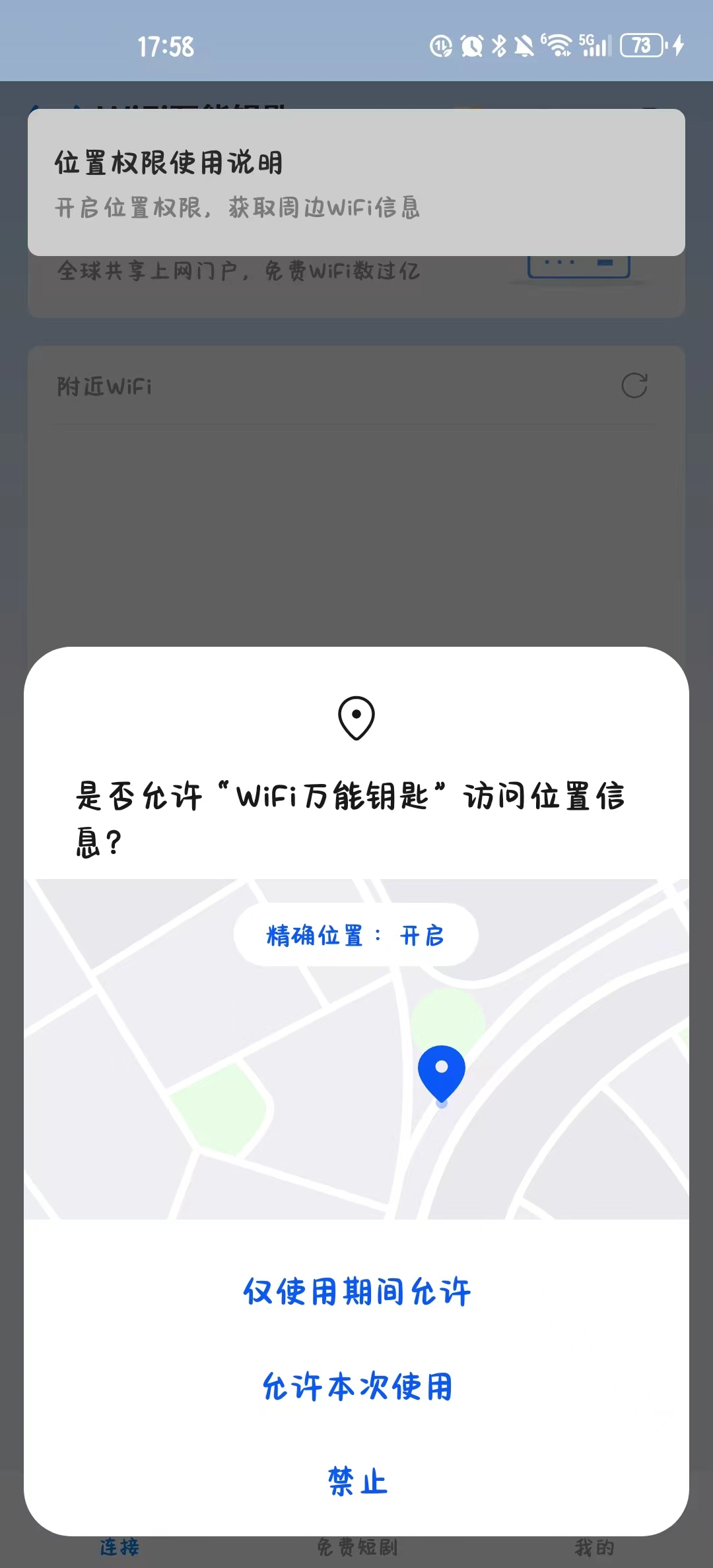 1、進入頁面后需要開啟地理位置權(quán)限,才能夠精準定位并查找附近免費WiFi;