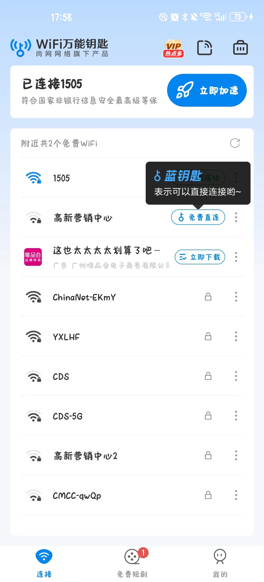 a:若該加密wi-fi熱點已共享,則可以使用萬能鑰匙進行連接使用;若該加密wi-fi熱點尚未共享,則您可以共享該熱點。