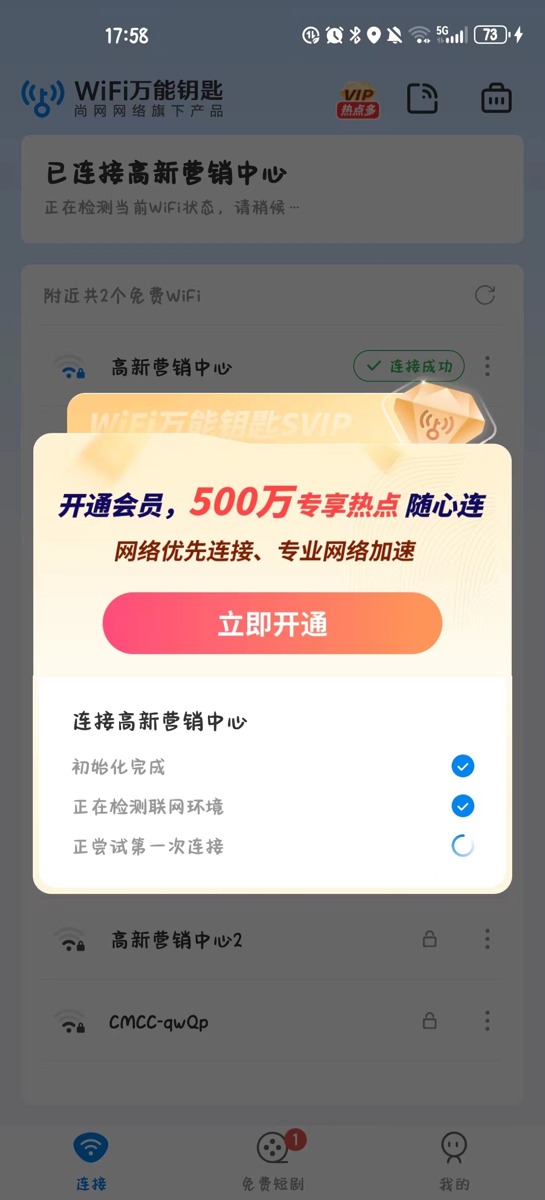 4、點擊有藍鑰匙的WiFi后將會自動進行連接,并進行初始化和檢測網(wǎng)絡(luò)環(huán)境后即可連接。