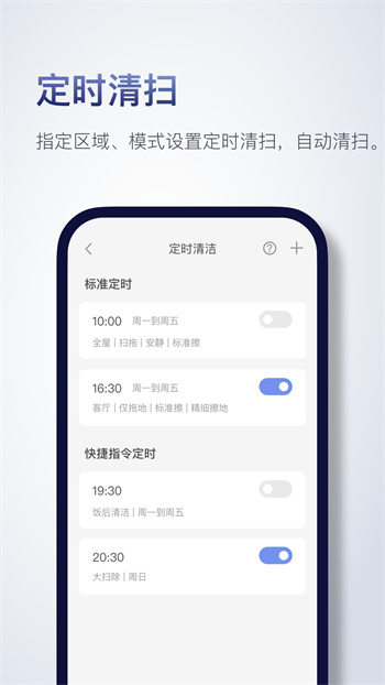 預(yù)約定時(shí)清掃任務(wù),機(jī)器人將在指定開始清掃任務(wù),完成后將自動(dòng)返回充電座。