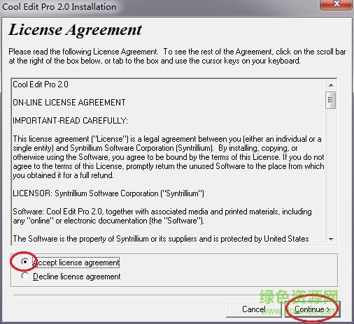 2.開始安裝界面是英文的,別擔(dān)心,按小編的指示進(jìn)行操作,選擇“Accept license agreement”,點(diǎn)擊“Continue”按鈕