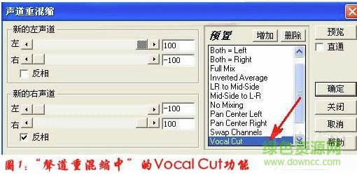 2.打開音頻后選擇“效果”→“波形振幅”→“聲道重混縮”,在打開的窗口中選擇“預(yù)置”里面的“ Vocal Cut ”見(圖 1 ),保持對(duì)話框上的默認(rèn)設(shè)置,點(diǎn)“確定”按鈕。經(jīng)過 CE 處理后,就得到了《命中注定》這首歌的伴奏音樂了。