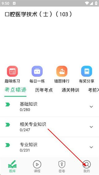 1、打開(kāi)口腔醫(yī)學(xué)技術(shù),點(diǎn)擊底部導(dǎo)航欄最右側(cè)我的。
