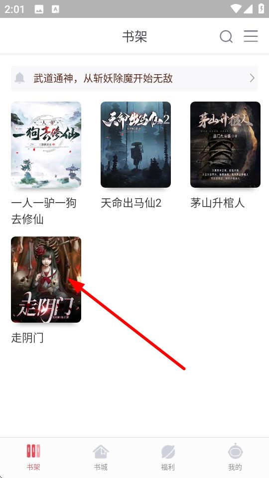 1、打開(kāi)火星小說(shuō)App,進(jìn)入書(shū)架頁(yè)面,點(diǎn)擊走陰門(mén)這本小說(shuō)的封面。