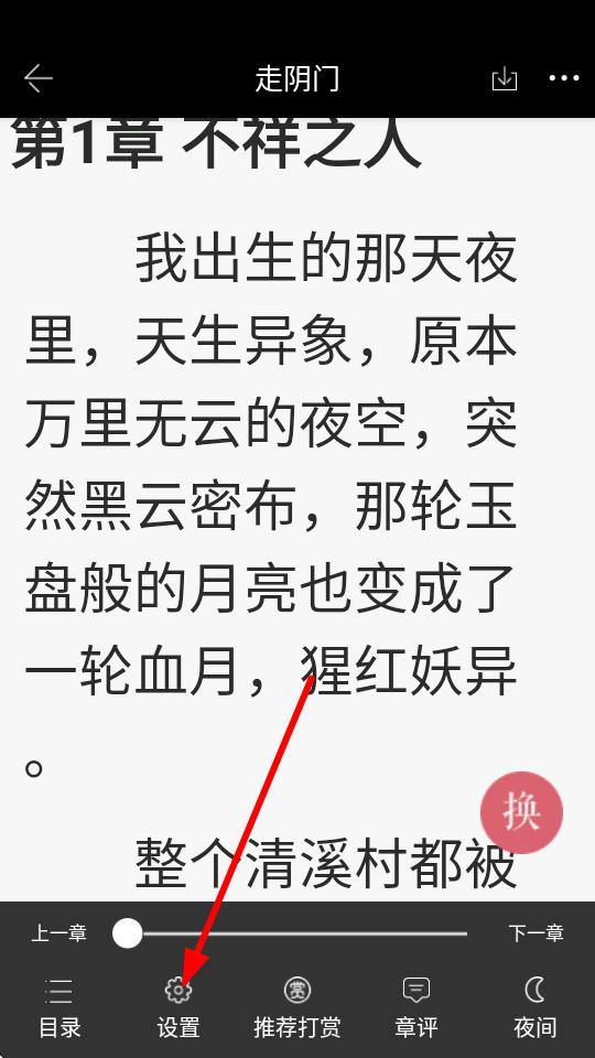 3、在小說(shuō)閱讀界面中,點(diǎn)擊屏幕中間位置,喚出底部菜單,然后點(diǎn)擊設(shè)置選項(xiàng)。