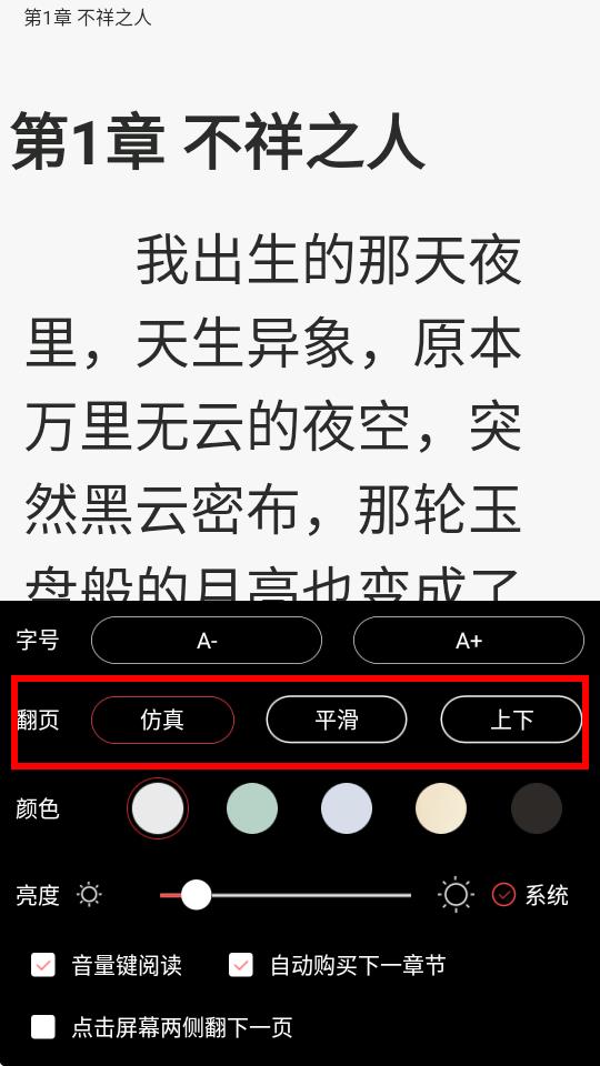 4、在設(shè)置界面里,找到翻頁(yè)設(shè)置區(qū)域,可選擇仿真、平滑、上下等翻頁(yè)模式來(lái)修改翻頁(yè)設(shè)置。