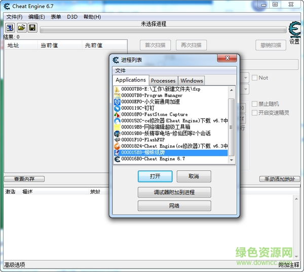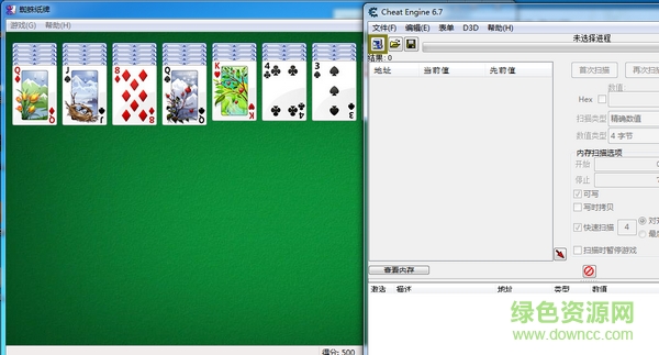 第一步:打開蜘蛛紙牌和ce,單擊如下綠色框框圖標(biāo)選擇需要查找內(nèi)存的進(jìn)程。