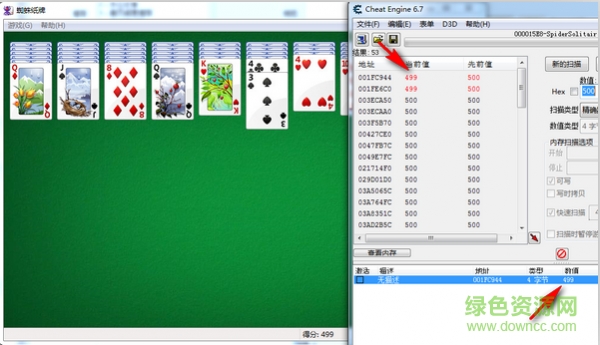 第四步:38找1猶如大海撈針,所以現(xiàn)在移動(dòng)一張牌,讓分?jǐn)?shù)減到499,運(yùn)氣不好,剩下兩個(gè)結(jié)果看不出來(lái)。先試第一個(gè),雙擊數(shù)值下面的499,讓它出現(xiàn)在下方的編輯框里。