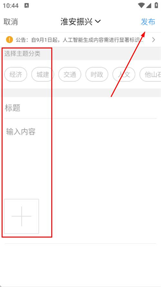 3、選擇主題分類(lèi),輸入標(biāo)題和內(nèi)容,添加圖片后,點(diǎn)擊發(fā)布。