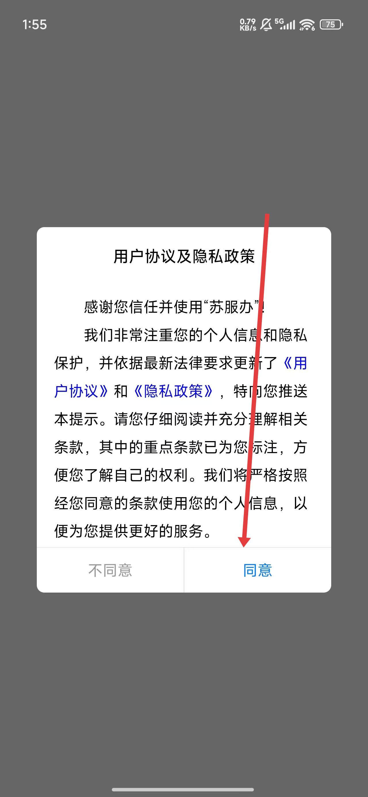1、打開蘇服辦app后,通過點(diǎn)擊彈窗中的同意按鈕,進(jìn)入使用。
