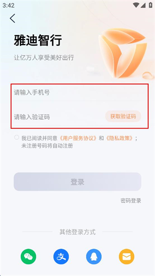 2、在個人中心界面點擊登錄/注冊選項,進入雅迪智行登錄界面。